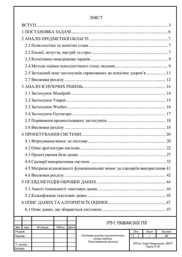 У дипломному проекті було розроблено компоненти системи аналізу психологічного стану людини, а саме – базовий функціонал серверної частини, база даних та робота з нею, веб-інтерфейс користувача. В рамках серверної частини було створено REST API, роботу з даними користувача, що описують його психологічний стан, інтеграцію з соціальними мережами, аналіз текстів на тональність та класифікацію текстів, використовуючи сторонні API.