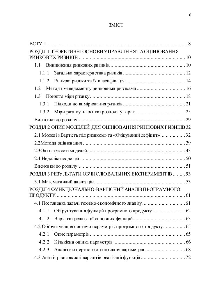 висновків що до ринкових ризиків з їх використанням.Огляд моделей з їх характерними рисами для розгляду динаміки мінливості процесів та їх прогнозування.Подальший огляд моделей та відповідних показників якості, що забезпечують вибір кращої моделі для оцінки безпеки фінансових операцій. В роботі наводиться метод оцінки ринкового ризику Value at Risk.