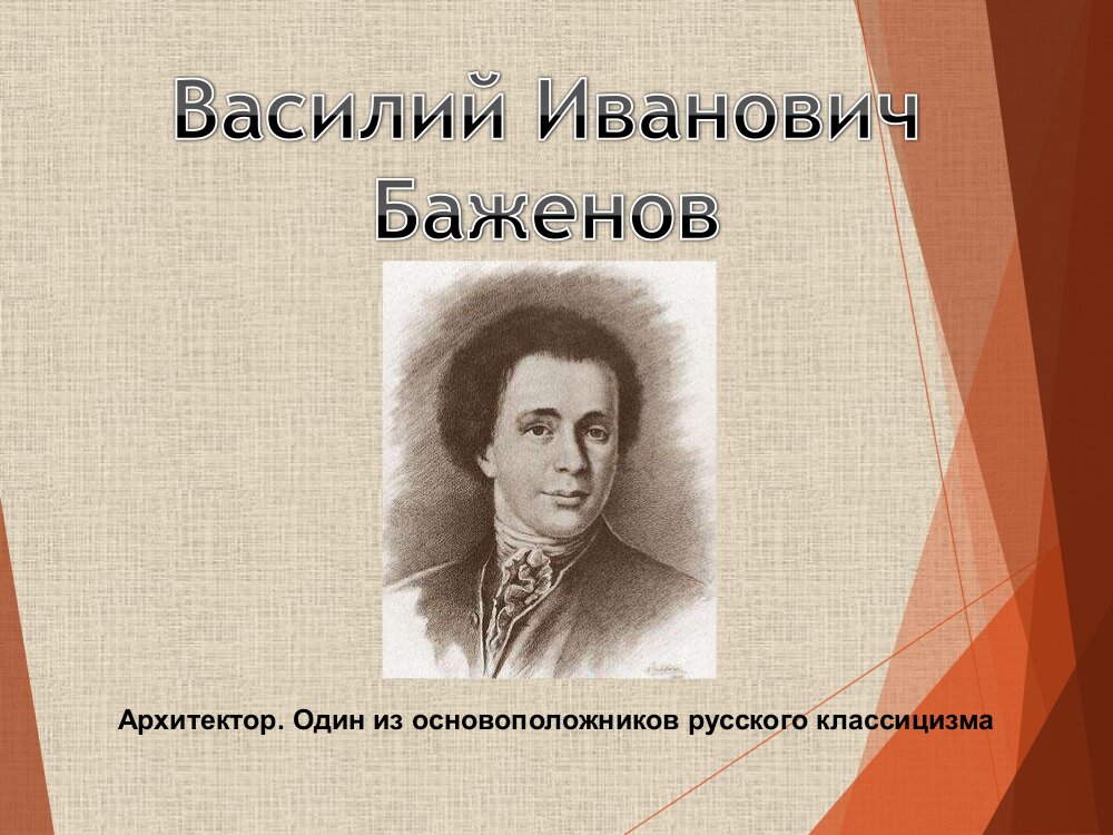 Василий Иванович Баженов родился в феврале 1737 года в семье Ивана Баженова, служившего в селе Дольском Малоярославского уезда Калужской губернии. Когда мальчику было лишь три месяца, его родители переехали в Москву, где отец стал дьяком одной из кремлевских церквей.