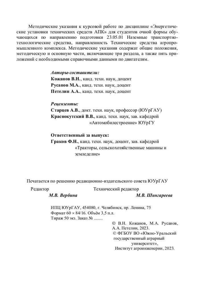 Методические указания к курсовой работе по дисциплине «Энергетические установки технических средств АПК»
